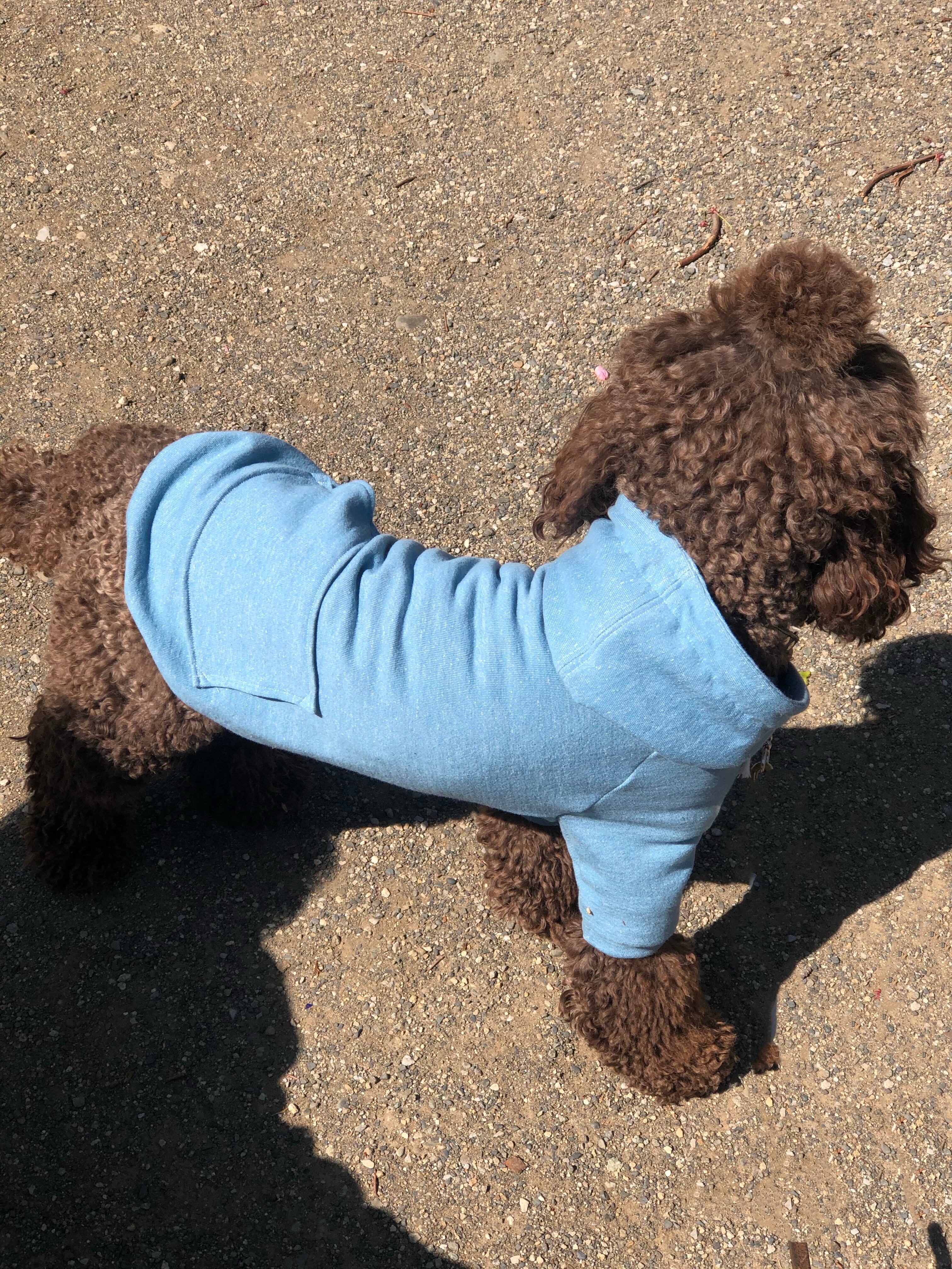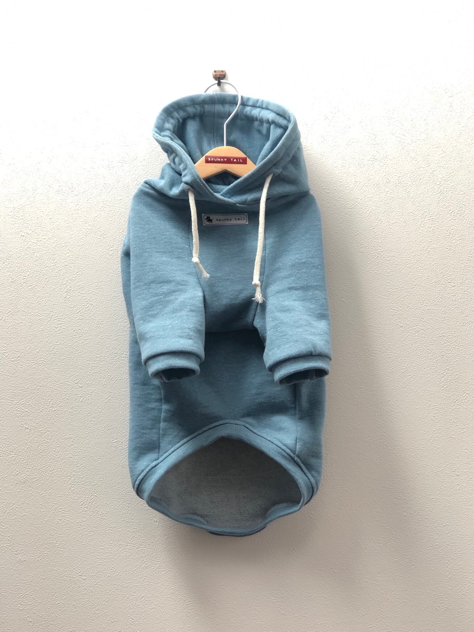 単色のシンプルなパーカーです。 フードの部分に紐が通っており、結ぶ事も可能です。お背中側には大きなポケットをお付けしました。 カラーはブルーとグレーからお選びいただけます。オーナー様とコーディネートしやすい1着です。